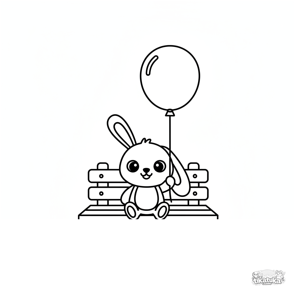 Página simples para colorir para bebês 2-3: um coelho grande de pelúcia com balão sentado em um banco. Formas grandes e claras.