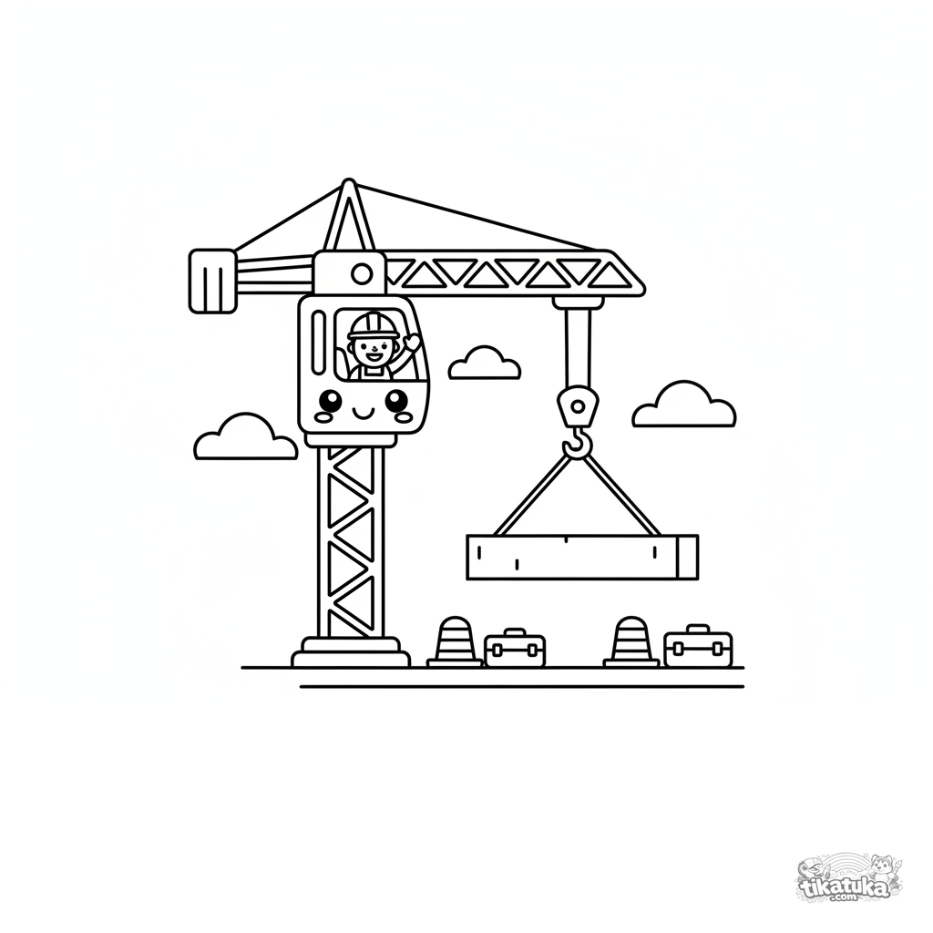 Página simples para colorir para bebês 2-3: um grande guindaste de construção amigável trabalha em uma ponte sobre um rio. Formas grandes e detalhes mínimos são perfeitos.
