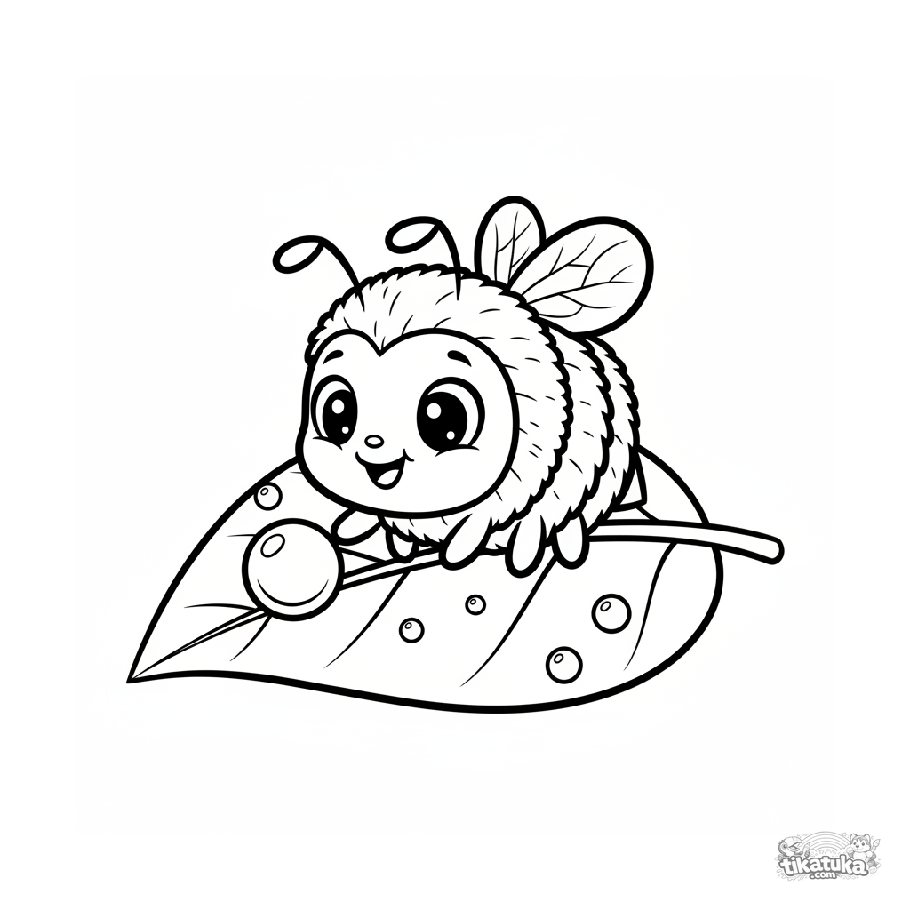 Página para colorir muito simples para 2-3 anos: um zangão fofo com olhos grandes senta em uma folha e toca uma gota de orvalho.