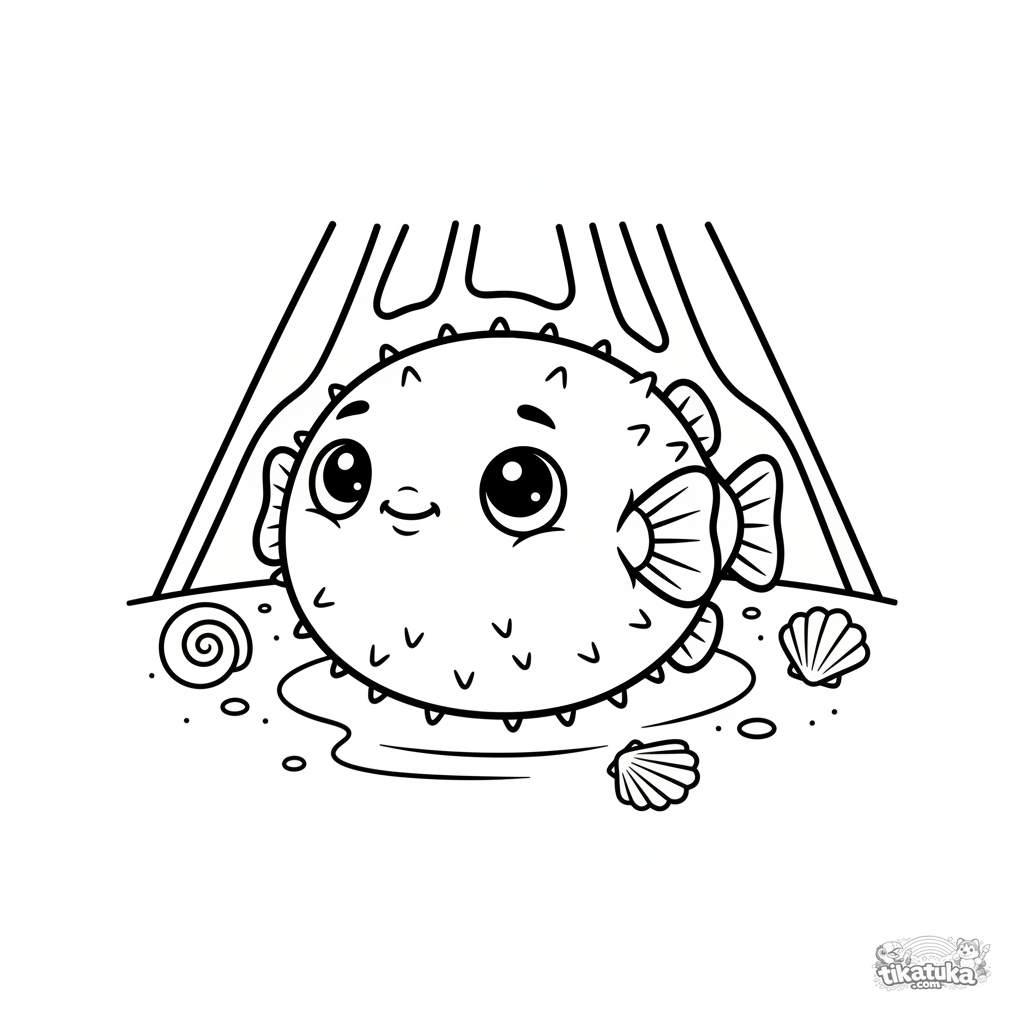 Página simples para colorir para crianças pequenas: um baiacu redondo descansa no fundo arenoso sob raios de sol. Para 2-3 anos. Formas grandes, margens amplas.