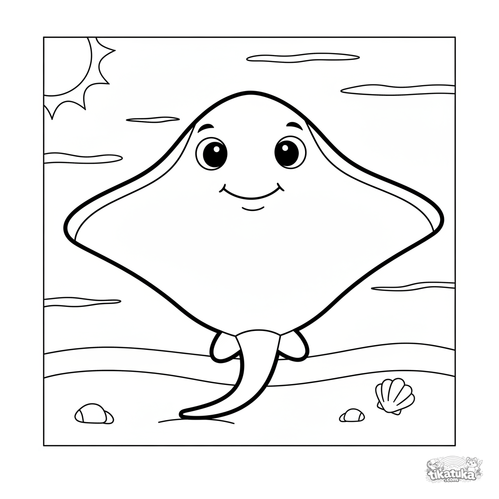 Página para colorir simples de uma arraia grande e amigável descansando na areia ensolarada. Para crianças pequenas 2-3 anos, formas simples e grandes.