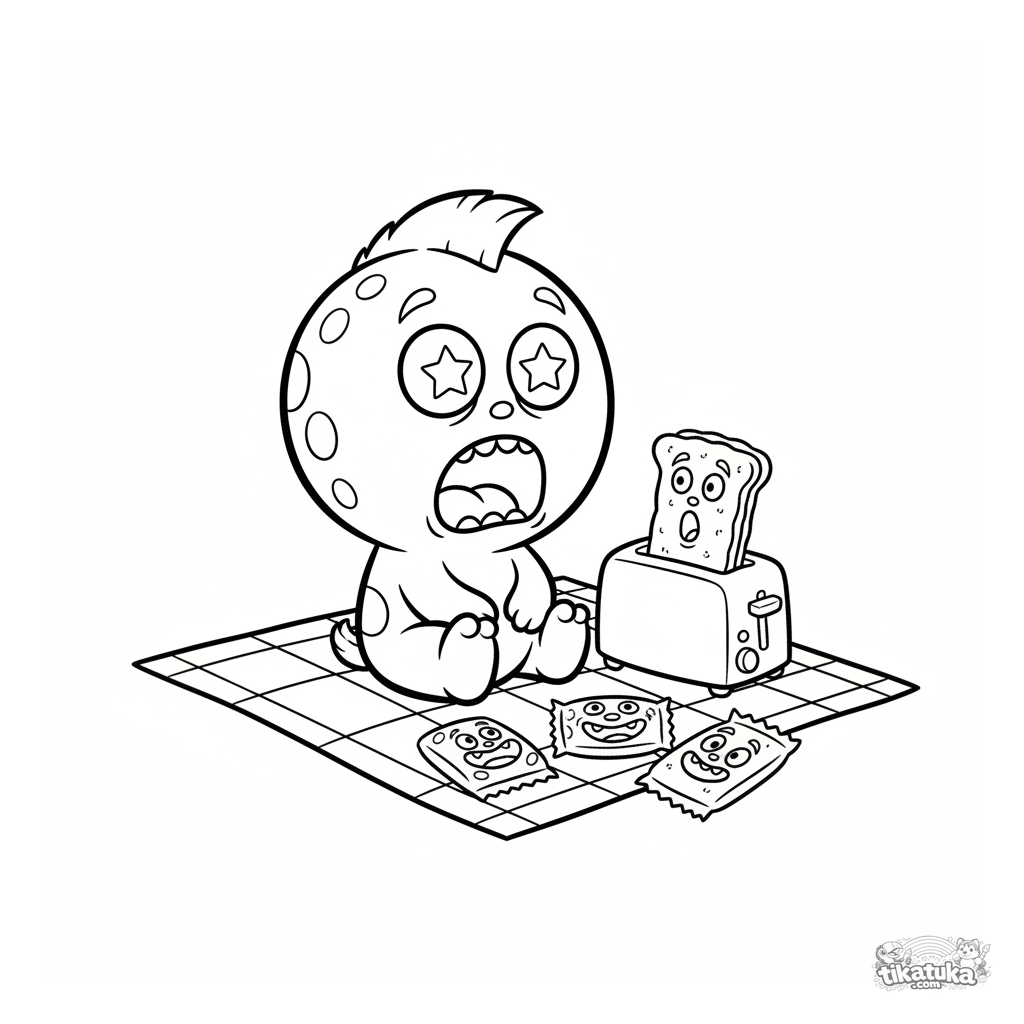 Página para colorir simples para bebês 2-3 anos: um monstro cabeção fica muito surpreso com uma torta pop saltando. Formas grandes.