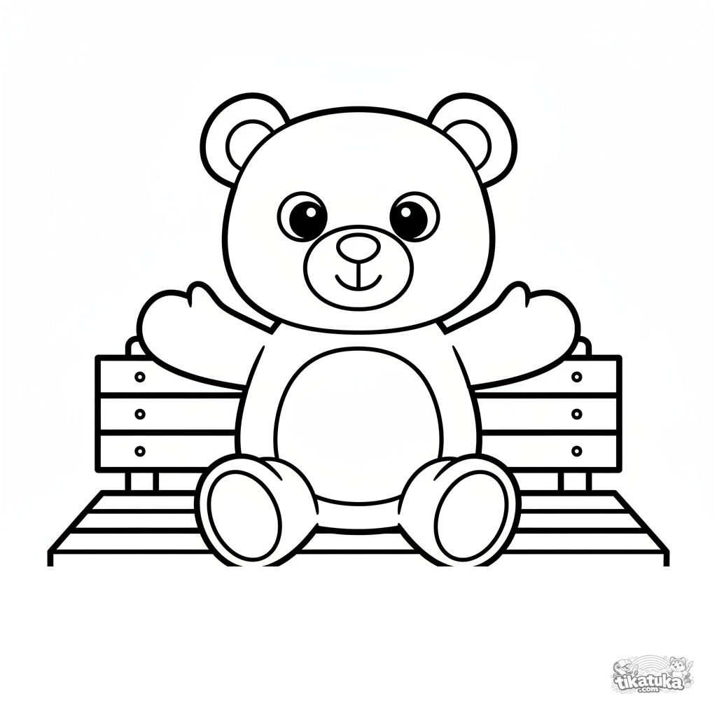 Página para colorir muito simples para bebês 2-3: um grande urso de pelúcia sentado num banco de parque. Formas grandes, muito espaço livre para colorir.