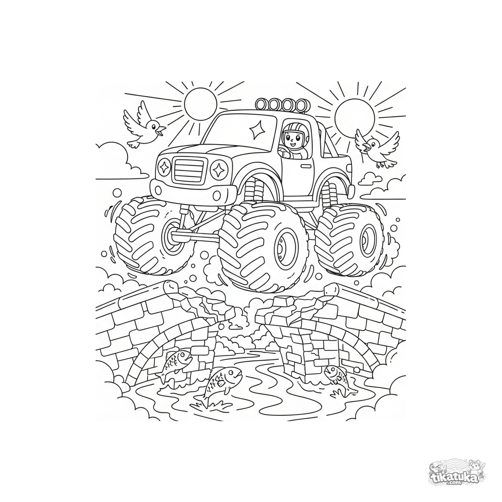 Página para colorir para pré-adolescentes 7-9: um monster truck poderoso dá um pulo numa ponte de pedra sobre um rio. Motorista de capacete, nuvem de poeira.
