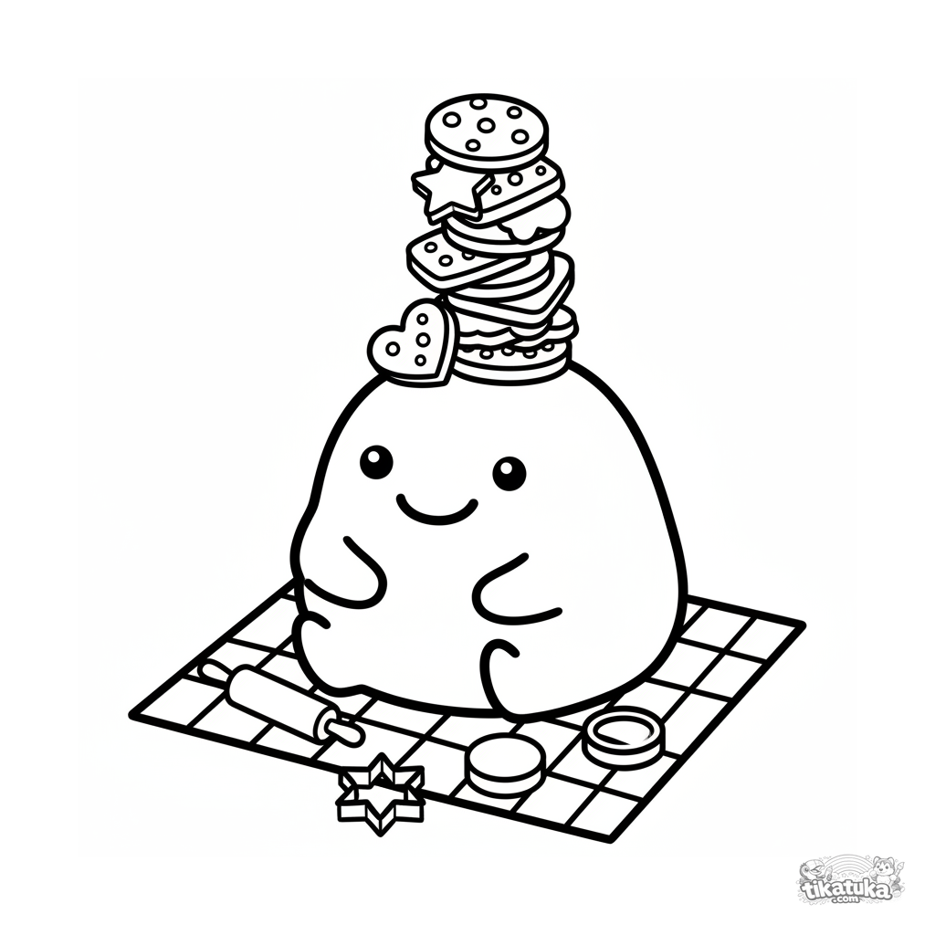 Página muito simples para bebês 2-3 anos: um monstro bolha equilibra uma torre de biscoitos em um piquenique. Contornos grandes e claros.