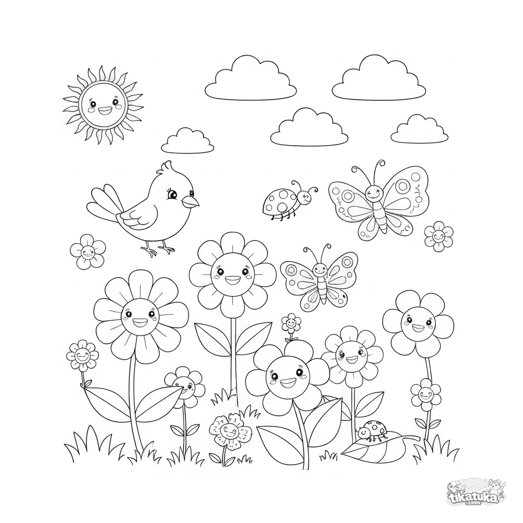 Pinte este jardim amigável com flores e borboletas! Perfeito para um momento criativo com as crianças.