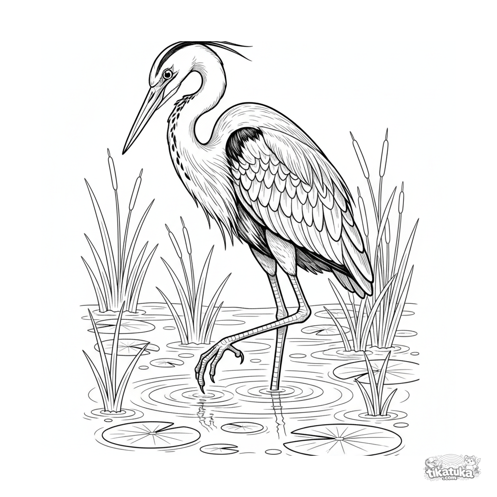 Página detalhada para colorir para crianças 10-12: uma garça elegante fica parada em um riacho claro, observando a presa. Ilustração realista com juncos e ninféias.