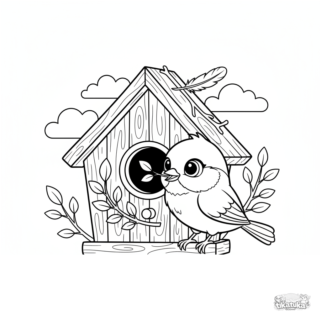 Página para colorir para crianças de 4-6 anos: um alegre chapim decorando a entrada de uma casa de pássaros com um galho. Cena clara e colorida com detalhes equilibrados.