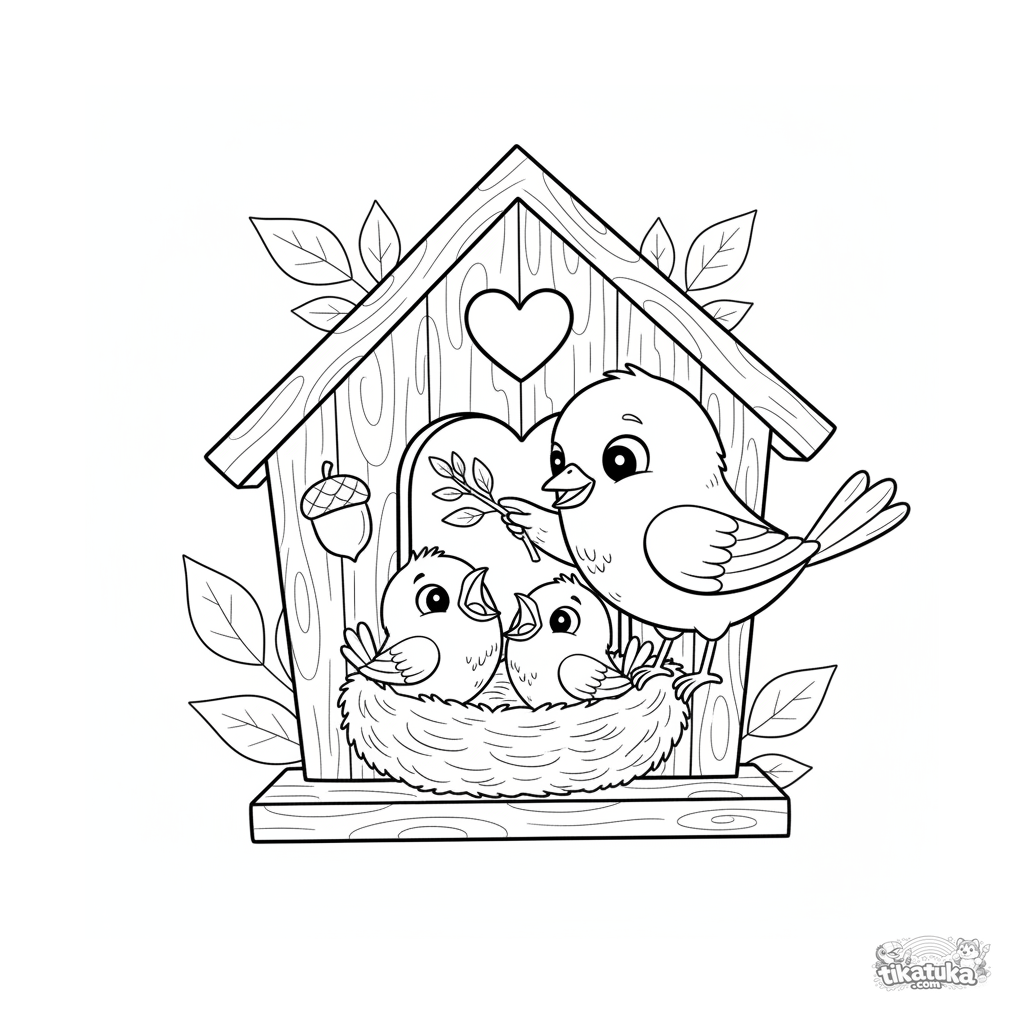 Página para colorir para crianças de 4 a 6 anos: uma família de chapim-azul dentro de uma aconchegante casa de pássaros de madeira com um ninho.