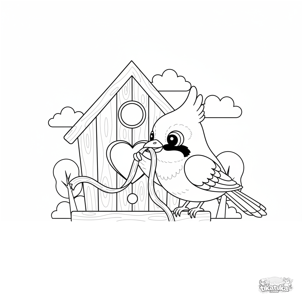 Página para colorir para 7-9 anos: um gaio-azul em estilo de boneco de pelúcia decora uma casa de pássaros com uma fita. Cena criativa.