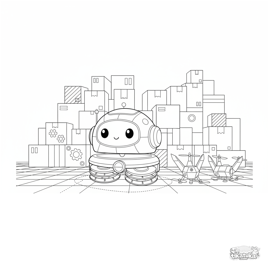Página para colorir elegante para crianças mais velhas 10-12: um robô faxineiro no estilo de diagrama de engenharia, arrumando o chão de um armazém. Linhas geométricas, design único.