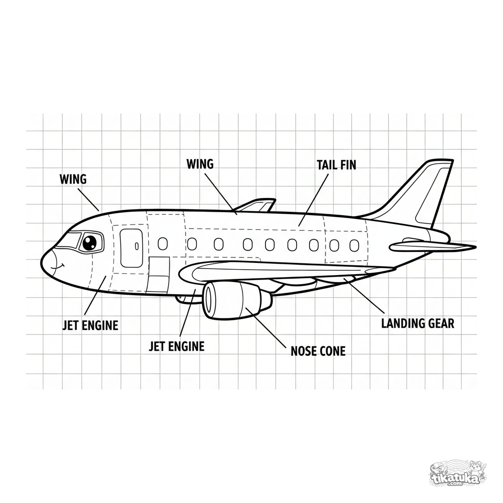 Página para colorir no estilo de um diagrama de engenharia de um avião de passageiros moderno. Grade, linhas tracejadas e rótulos. Para 7-9 anos.
