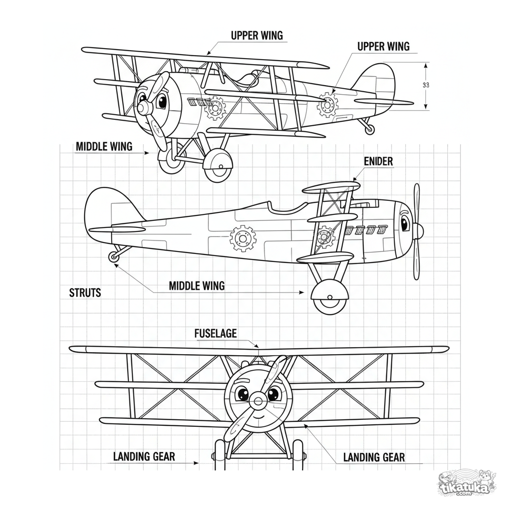 Página educativa para colorir no estilo de um diagrama de engenharia de um triplano da Primeira Guerra Mundial. Diagrama estilizado para crianças de 10 a 12 anos.