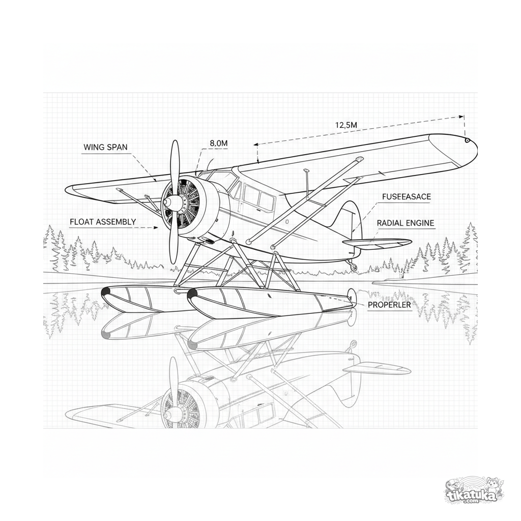 Página para colorir estilo planta baixa de um hidroavião de meados do século em um lago. Para 10-12 anos. Traços detalhados, flutuadores e reflexo.
