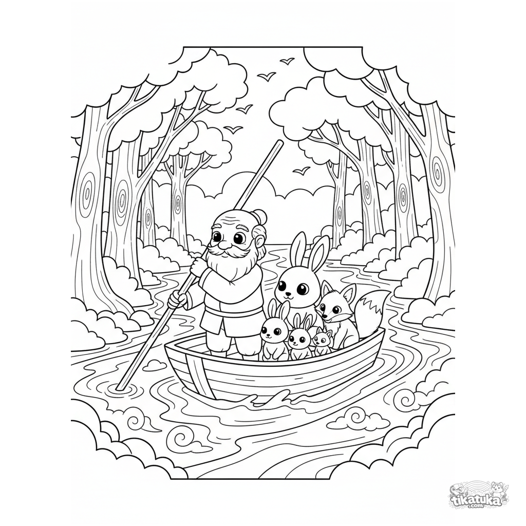 Página para colorir para crianças: um barqueiro gentil transporta animais através de um rio em uma floresta antiga. Cena tranquila e gentil, adequada para crianças de 5 a 9 anos.