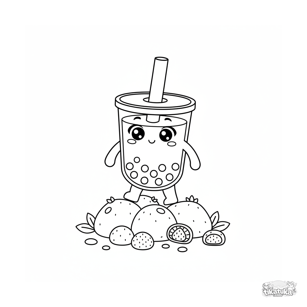 Página para colorir: um copo de boba com olhos grandes explora colinas de mochi de morango. Pose dinâmica e detalhes de fundo para 7-9 anos.