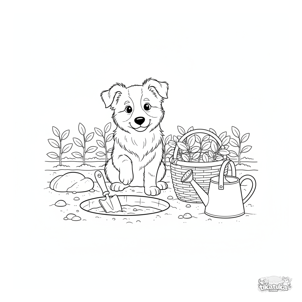 Página para colorir crianças: um fofo filhote de border collie ajudando em um jardim de primavera, sentado ao lado de um buraco de plantio com ferramentas. Contornos claros, cena fofa.