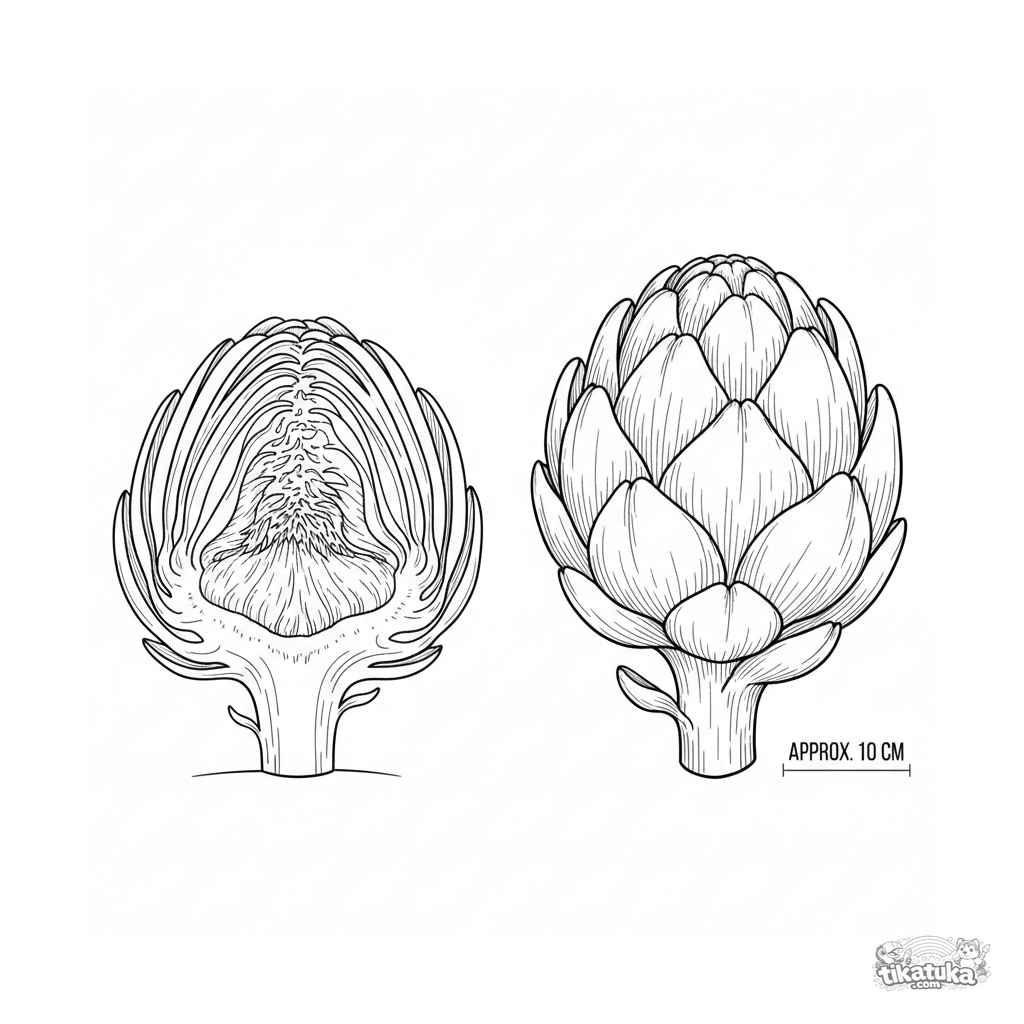 Página para colorir para crianças maiores 10-12: um corte botânico detalhado de uma alcachofra no estilo de guia de campo. Ilustração educativa.