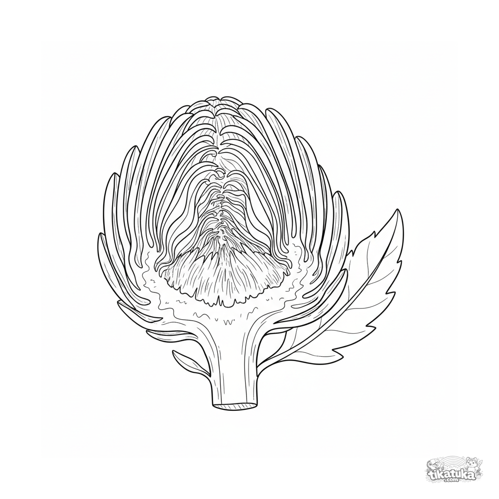Página para colorir detalhada do corte transversal de uma alcachofra para 10-12 anos. Estilo botânico educativo com fundo limpo.
