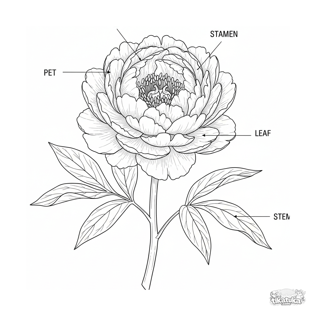 Página para colorir para crianças mais velhas: uma ilustração botânica detalhada de uma peônia com partes da flor rotuladas. Alto nível de detalhe, estilo educativo.