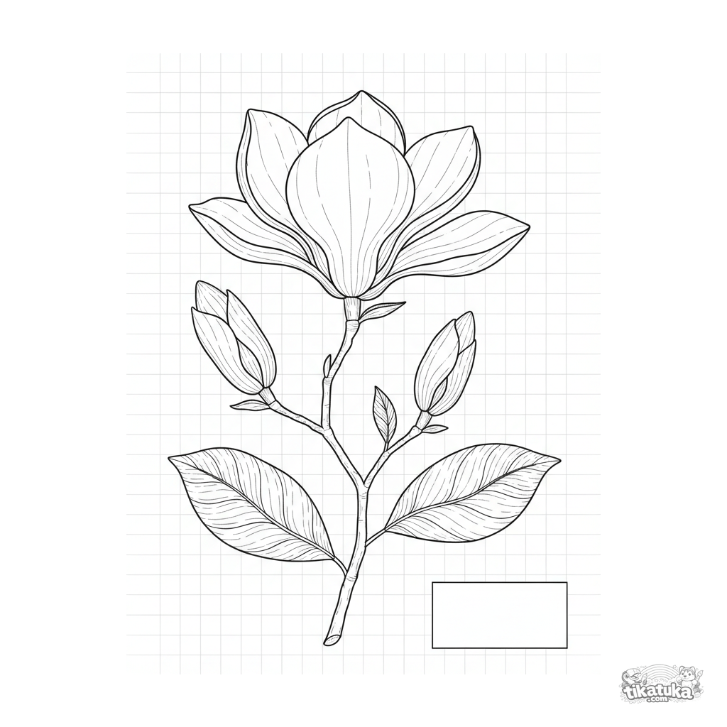 Página detalhada para colorir para crianças 10-12: um ramo de magnólia como espécime botânico prensado. Linhas precisas, texturas.