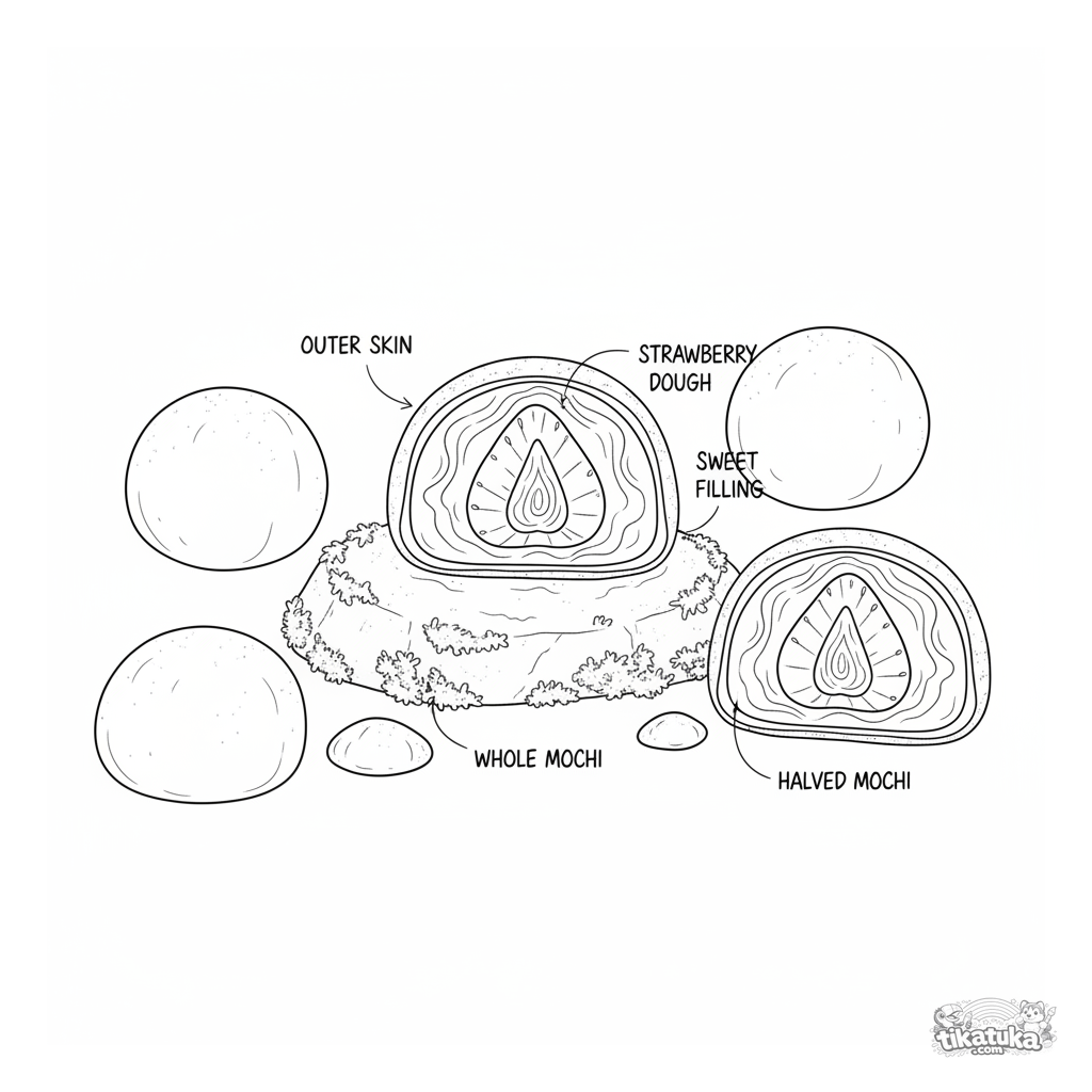 Página para colorir complexa estilo científico para crianças mais velhas 10-12: estudo botânico detalhado de um mochi de morango em corte transversal, com rótulos.