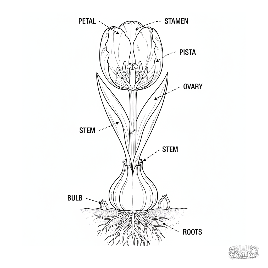 Página detalhada para colorir para 10-12 anos: desenho botânico em corte transversal de uma tulipa. Mostra a estrutura da flor, caule e bulbo.