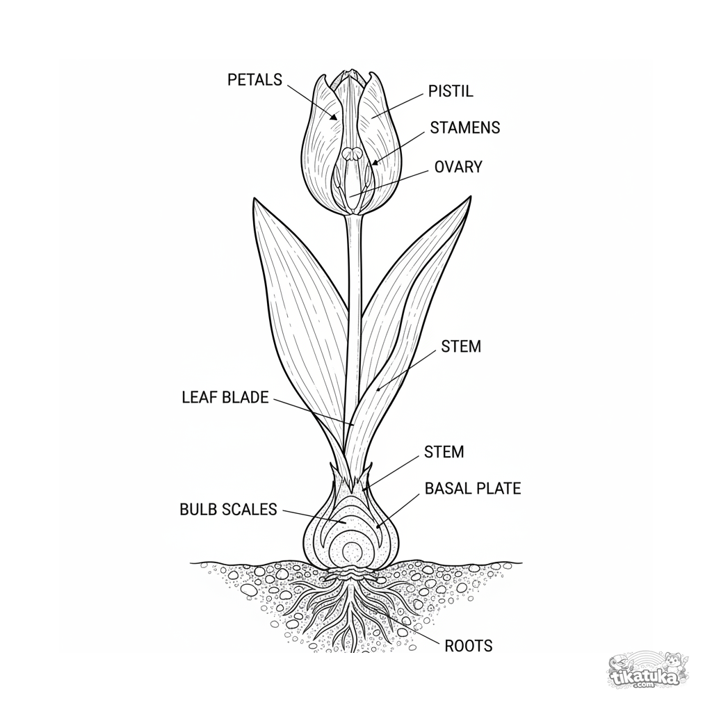Página para colorir para 10-12 anos: um desenho botânico detalhado de uma tulipa em corte transversal, mostrando o botão, caule, bulbo e raízes. Diagrama educacional.