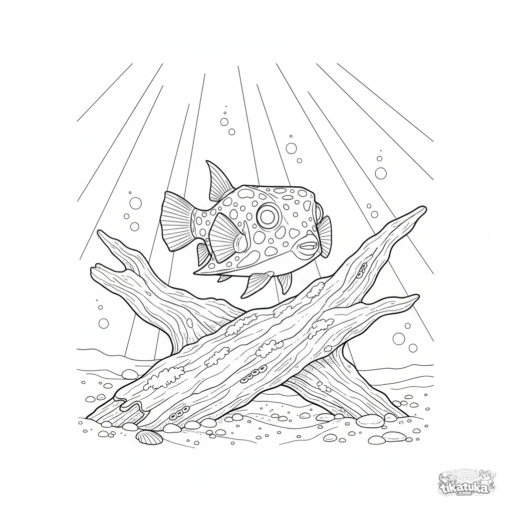 Página para colorir para crianças mais velhas 10-12: um peixe-cofre detalhado explora madeira submersa em um fundo arenoso raso iluminado pelo sol.