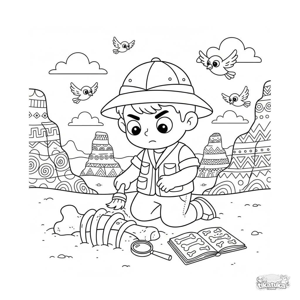 Página para colorir de um menino arqueólogo escovando um osso de dinossauro. Para meninos de 6 a 9 anos.
