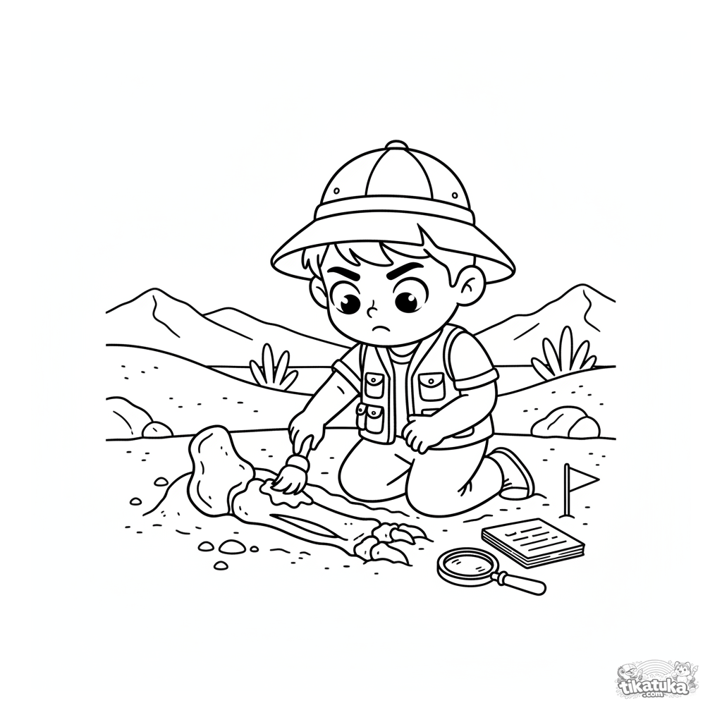 Página para colorir para meninos 5-8 anos: um jovem arqueólogo de chapéu e colete escova um fóssil de osso de dinossauro. Lupa, caderno e bandeira marcadora.