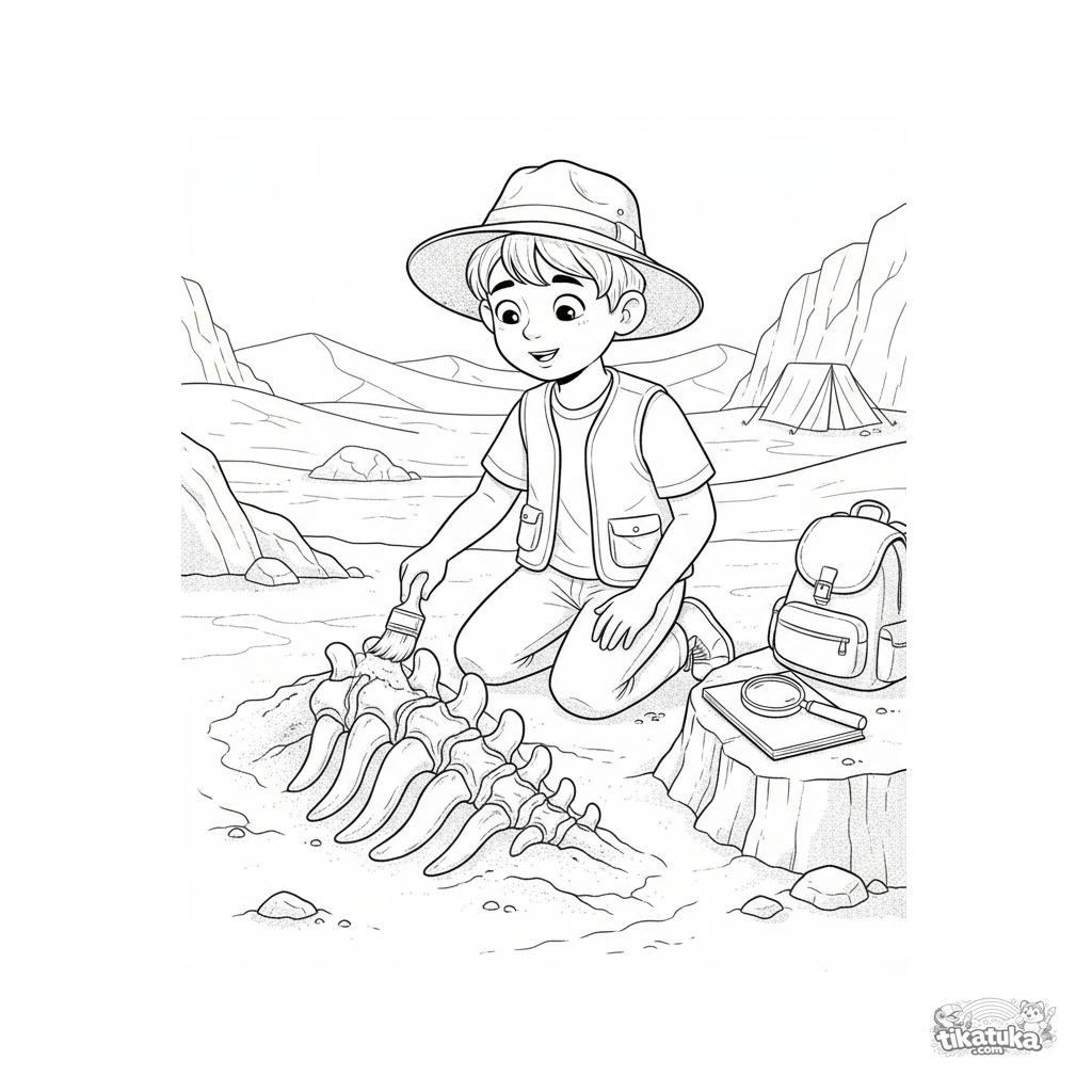 Página para colorir de um menino arqueólogo escovando cuidadosamente a areia de um grande fóssil de dinossauro em um sítio de escavação no deserto. Para crianças de 6 a 9 anos.