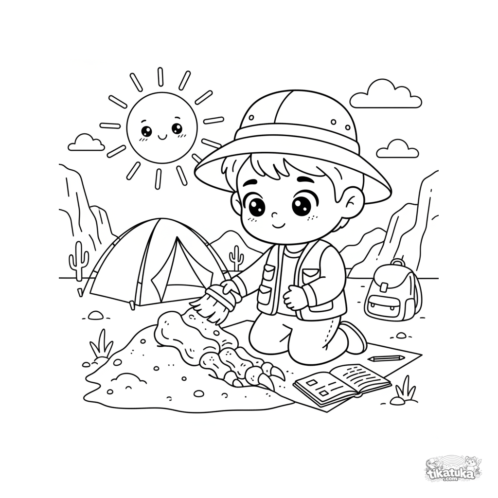 Página para colorir de um menino arqueólogo escovando um fóssil de dinossauro em um acampamento no deserto. Para crianças de 5 a 8 anos.