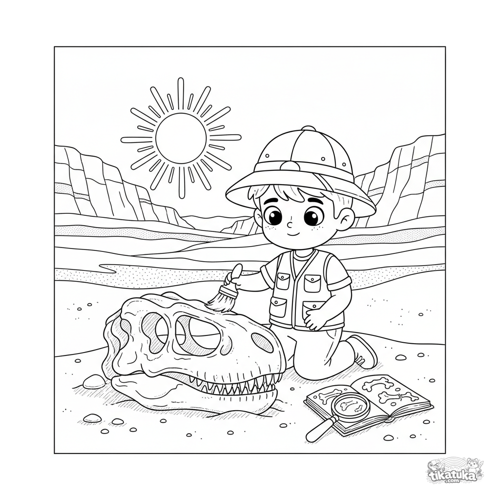 Página para colorir de um menino arqueólogo escovando a areia de um fóssil de dinossauro em um sítio de escavação. Para crianças de 6 a 9 anos.