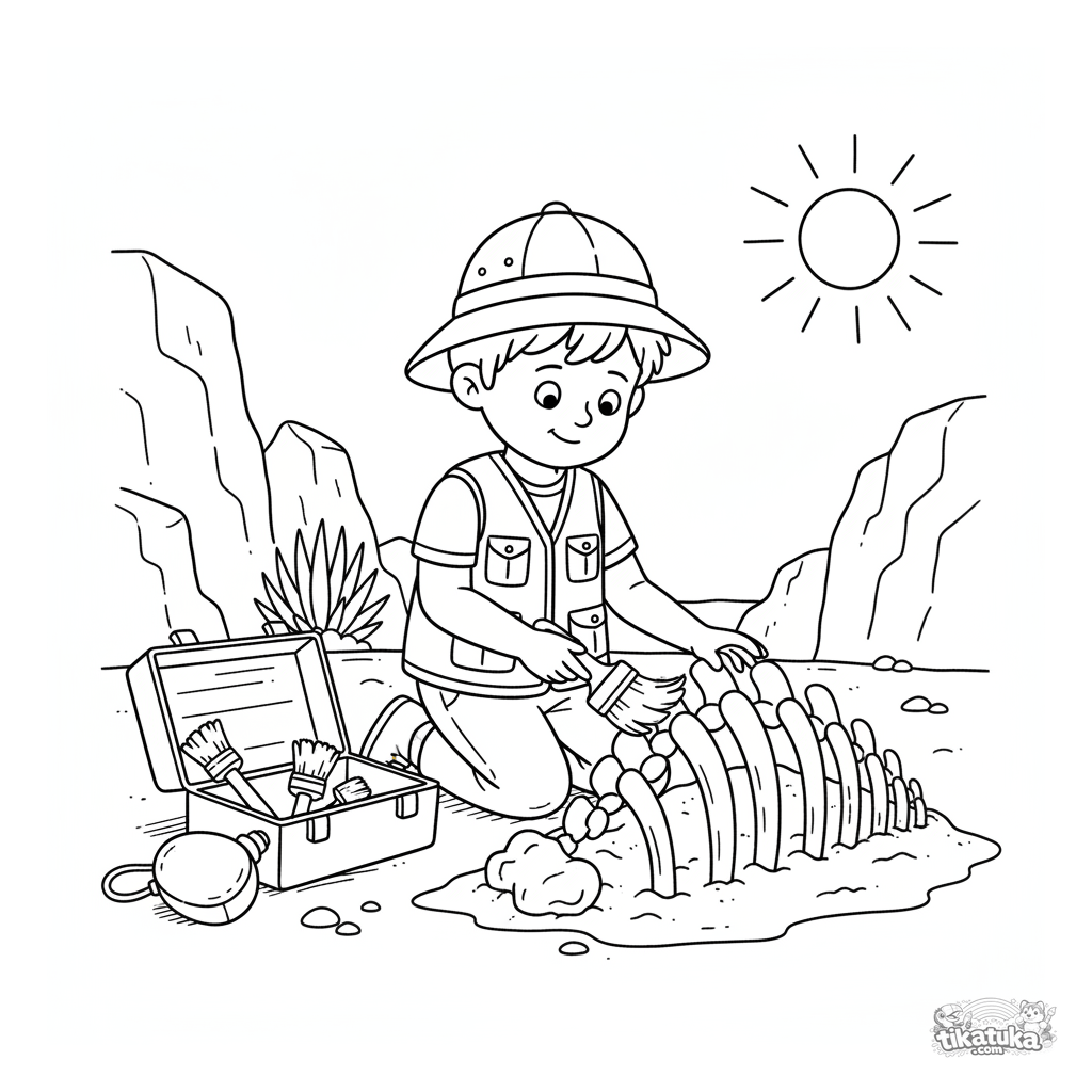 Página para colorir para meninos: um jovem arqueólogo examina curiosamente ossos de dinossauro em um sítio de escavação. Cena detalhada e educativa para crianças de 4 a 6 anos.