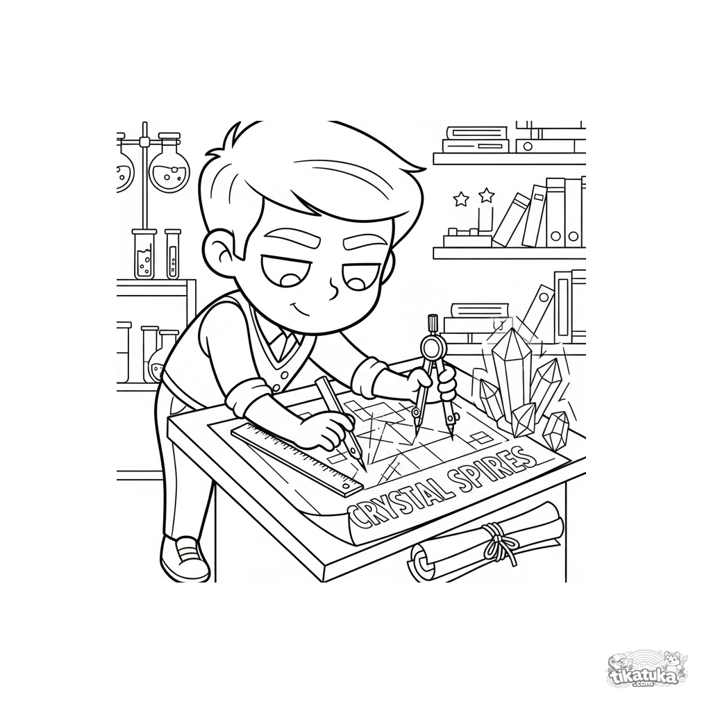 Página para colorir para crianças de 4-6 anos: um menino arquiteto desenhando a planta de uma cidade de cristal fantástica.