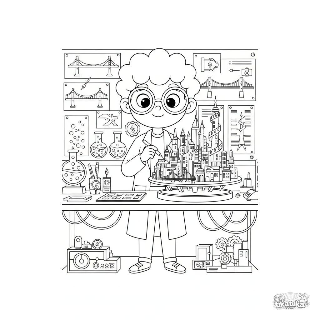 Página para colorir para crianças maiores 10-12: um menino arquiteto em um laboratório secreto trabalhando em um modelo flutuante de uma cidade futurista. Plantas e esquemas detalhados na parede.