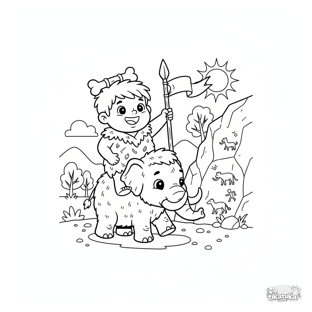 Página para colorir para meninos: um menino da Idade da Pedra monta um filhote de mamute perto de uma pintura rupestre. Para crianças de 5 a 8 anos. Cena de aventura pré-histórica divertida.