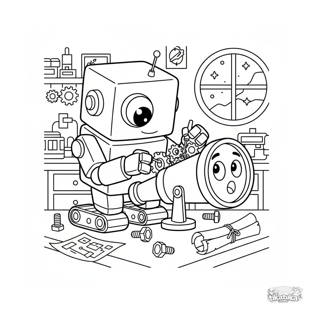 Página para colorir para crianças 4-6: um robô assistente amigável em um laboratório secreto conserta um telescópio falante. Forma quadrada, esteiras, chave de fenda.