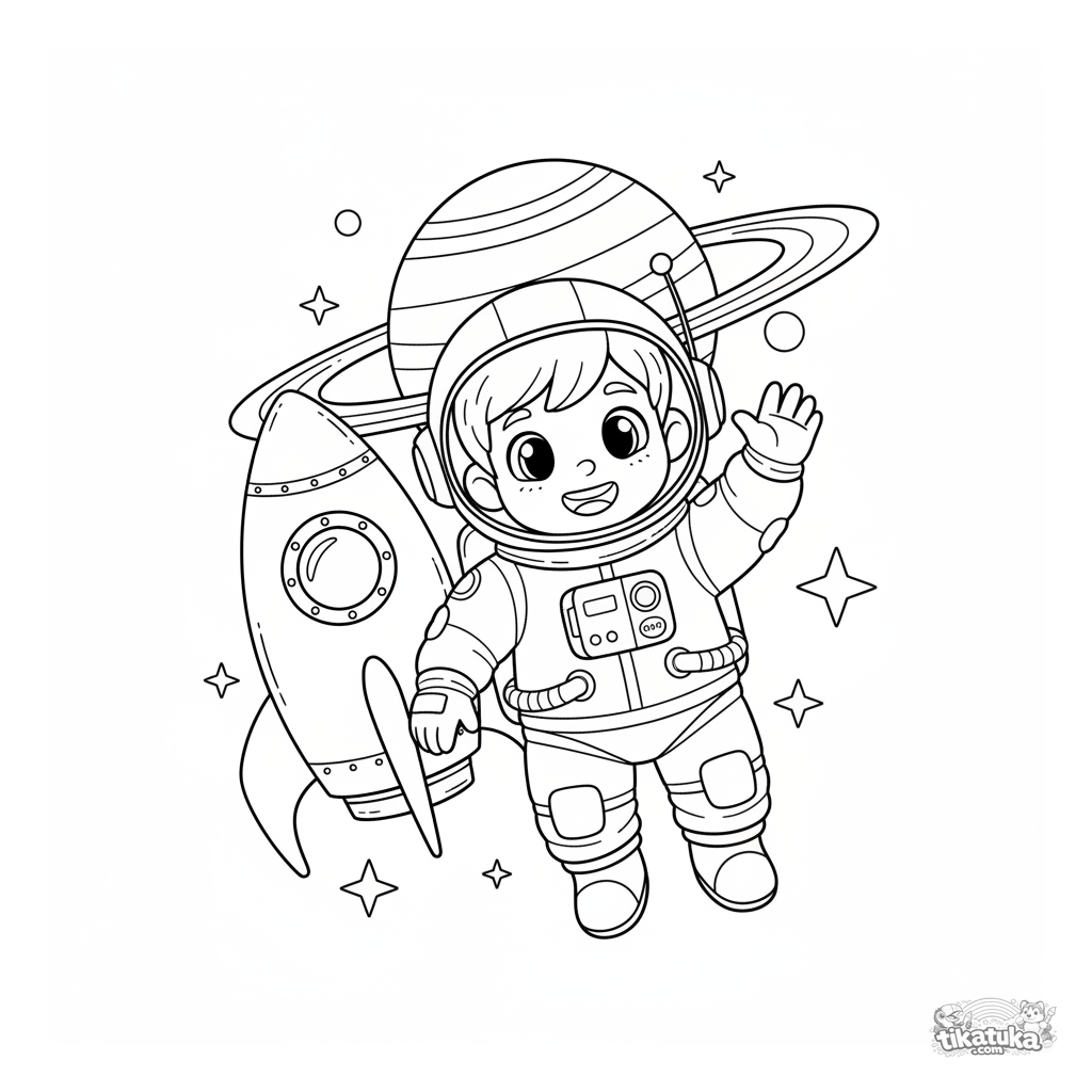 Página para colorir para meninos: um jovem astronauta flutua perto de um foguete com um planeta ao fundo. Para 4-6 anos.