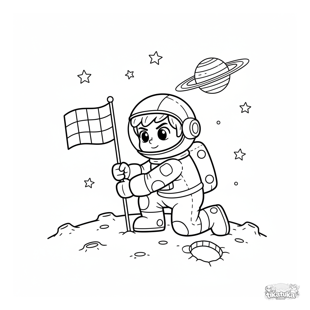 Página para colorir para meninos de 4 a 6 anos. Um jovem astronauta em traje espacial planta uma bandeira em uma cratera lunar.