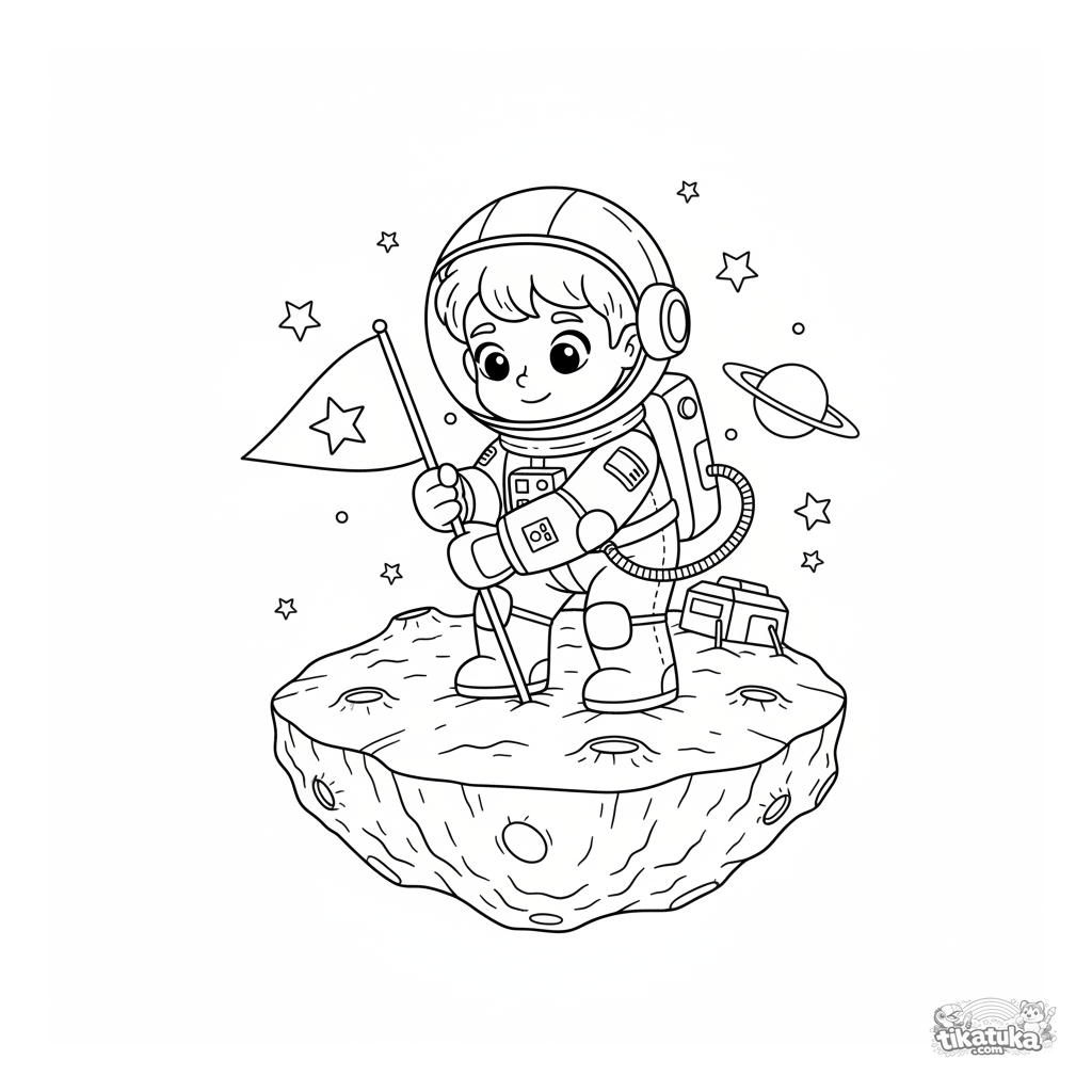 Página para colorir para meninos de 4-6 anos: um jovem astronauta planta uma bandeira em um asteroide no espaço sideral. Cena envolvente sobre exploração espacial.