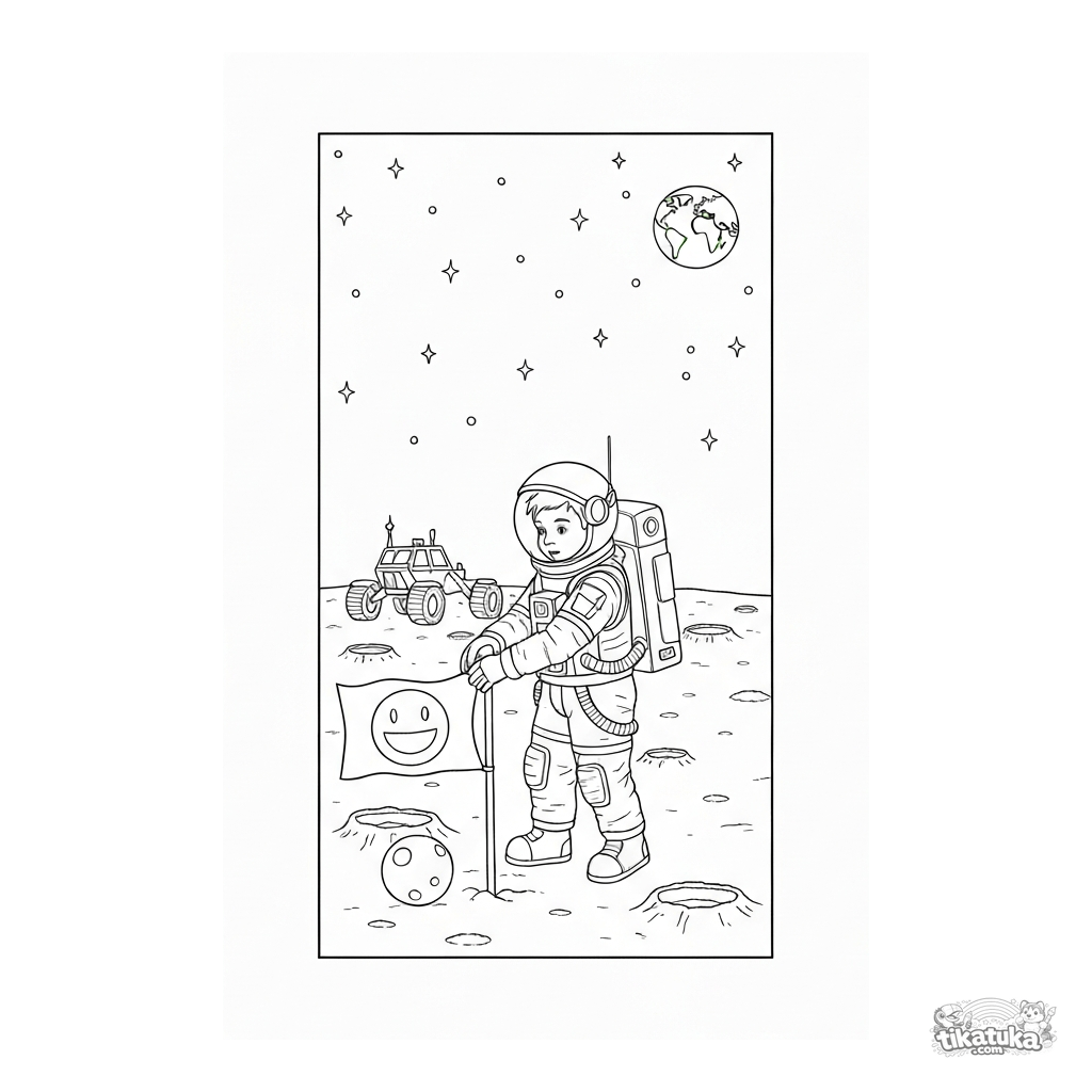 Página para colorir para meninos: astronauta na lua. Menino de traje espacial planta bandeira perto de um rover. Para crianças de 6 a 9 anos, estilo realista.