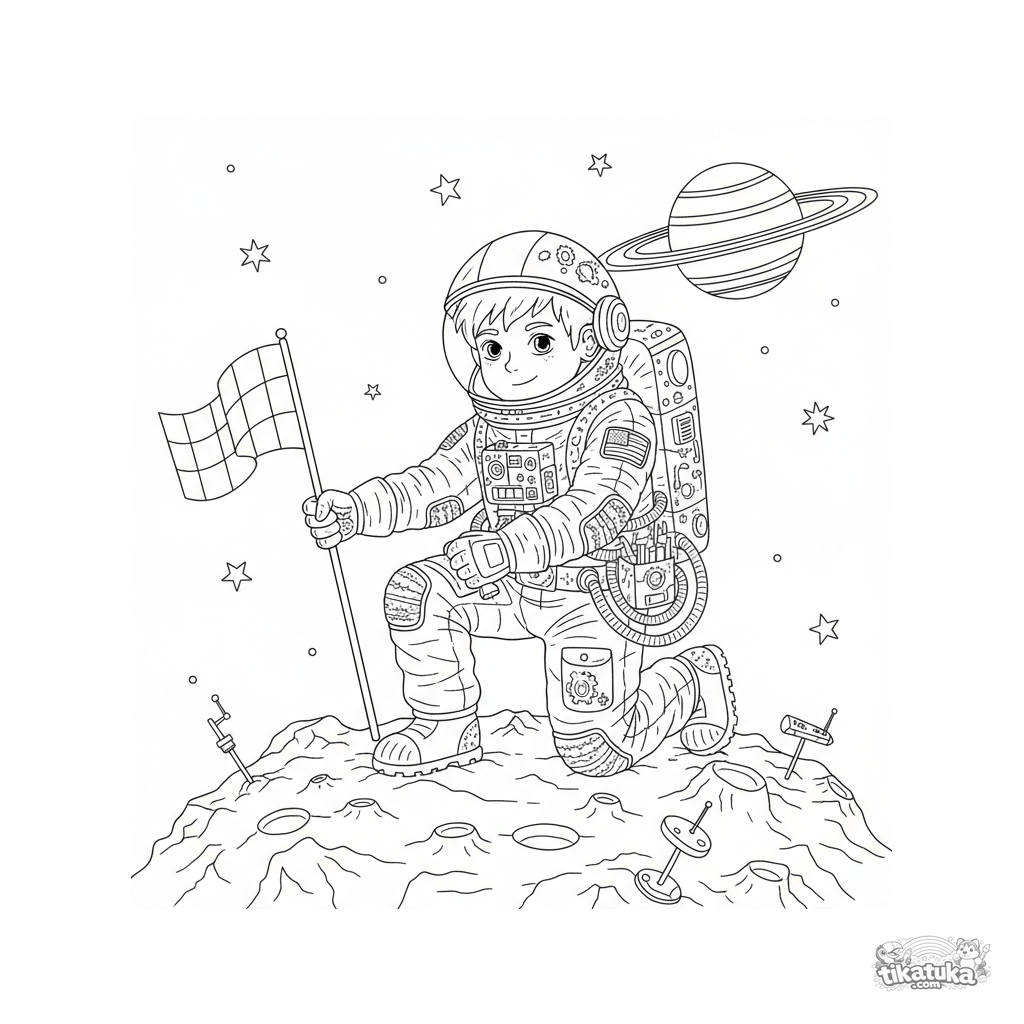 Página para colorir para meninos: um jovem astronauta planta uma bandeira em um asteroide. Para 6-9 anos. Roupa espacial detalhada.