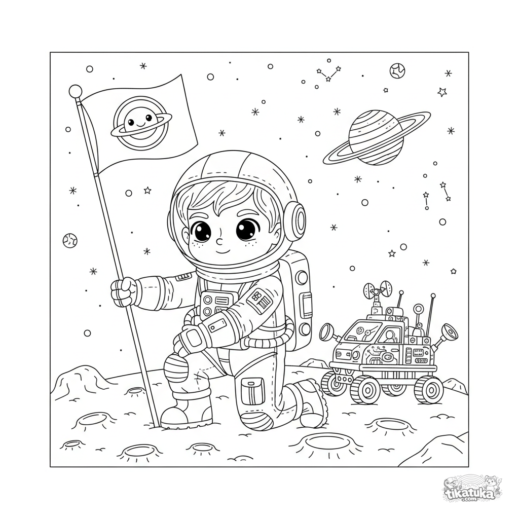 Página para colorir de um menino astronauta plantando uma bandeira na superfície craterizada da lua. Para crianças de 6 a 9 anos.
