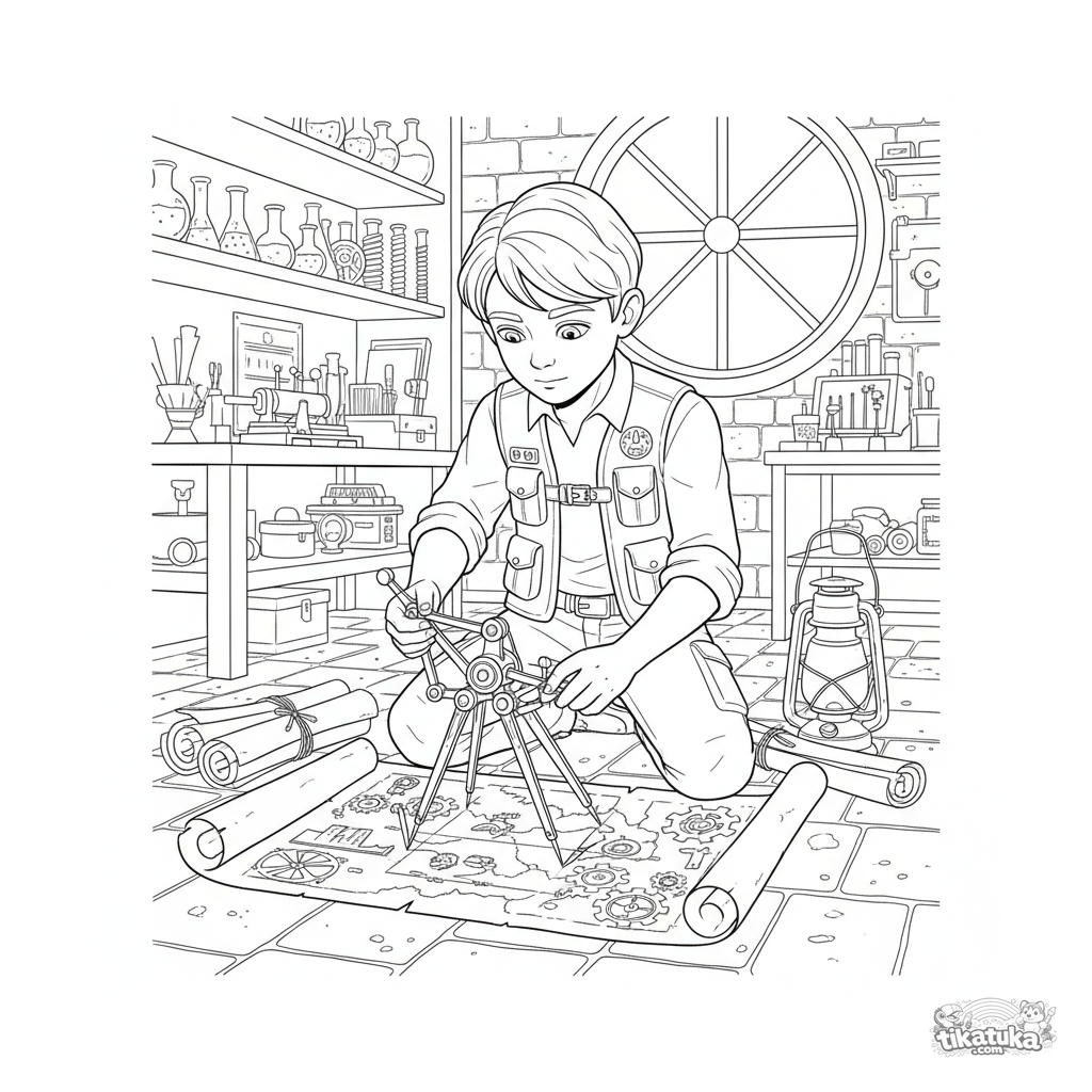 Página para colorir detalhada para crianças de 10-12 anos: um menino cartógrafo em um laboratório secreto desenha um mapa com uma bússola mecânica complexa. Estilo realista.
