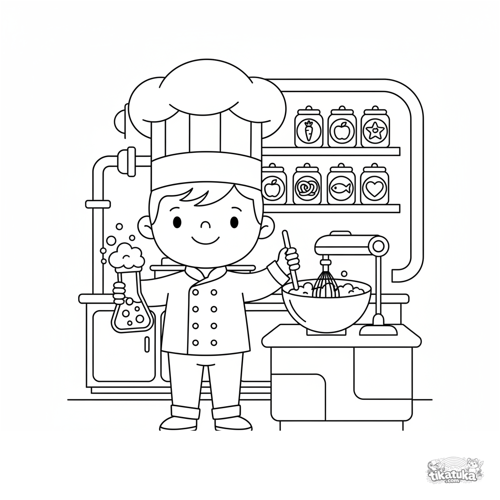 Página para colorir para meninos 4-6: um jovem inventor-chef em um laboratório secreto cria um prato mágico misturando ingredientes em frascos de química.