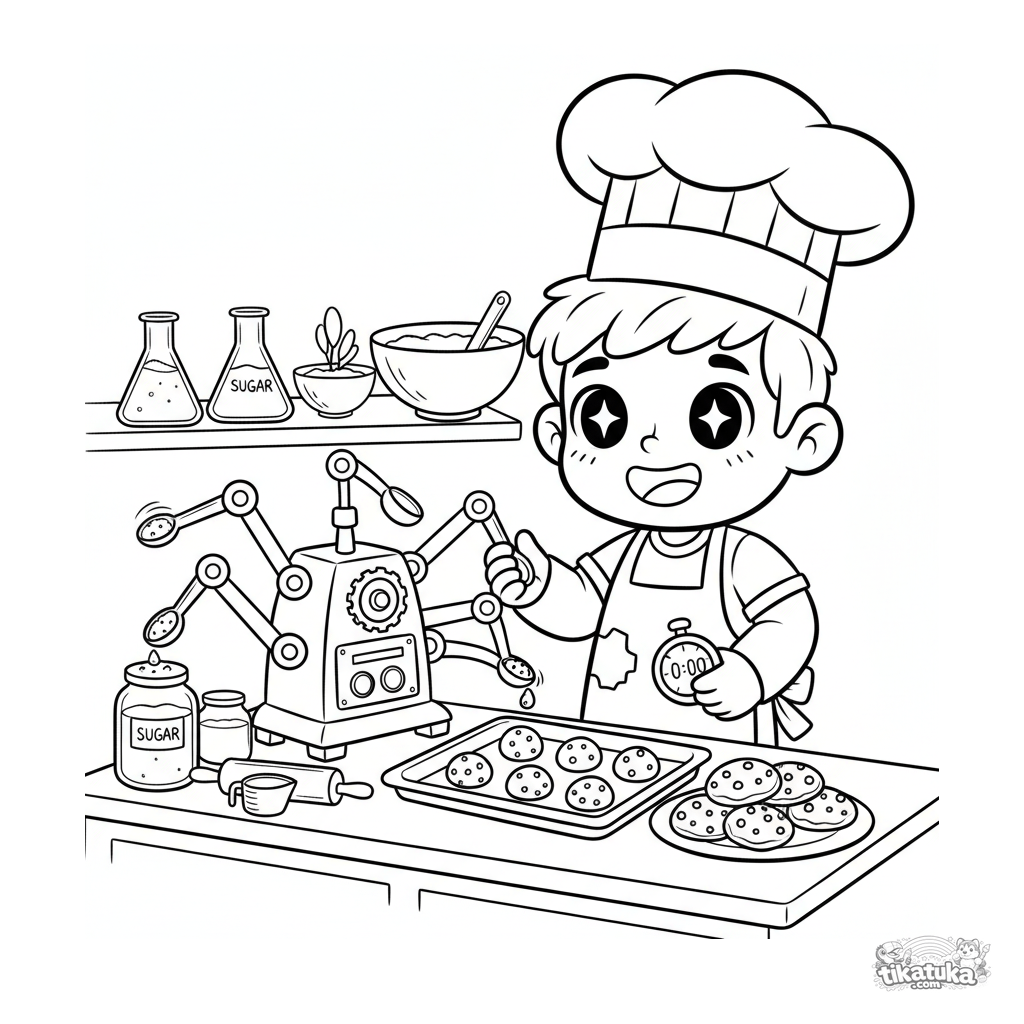 Página para colorir para crianças 4-6: um menino chef alegre em um laboratório testa sua invenção, uma máquina automática de fazer biscoitos. Cena brilhante e clara.