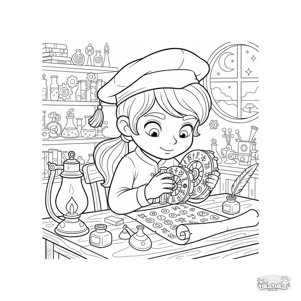 Página para colorir para crianças de 4-6 anos no estilo medieval: um menino de barrete de estudioso decifra um pergaminho antigo em um laboratório secreto. Detalhes decorativos.