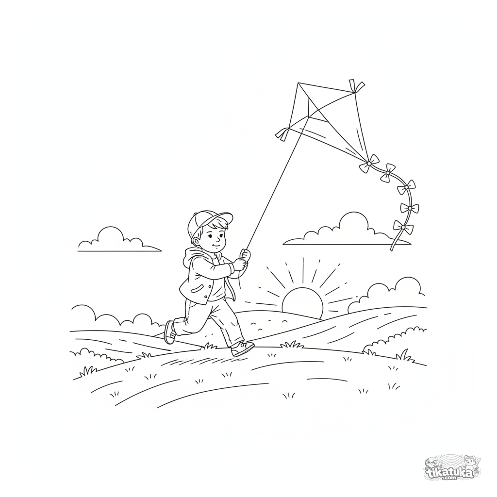 Página para colorir para meninos de 4-6 anos: um menino corre por um morro empinando uma pipa de diamante grande. Estilo realista, pose dinâmica.